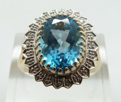 A 9ct gold cocktail ring set with an oval cut blue topaz with diamond surround, size U/V, 4.51g