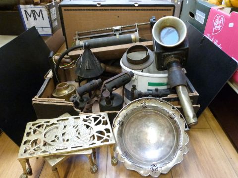 A collection of blow lamps, carriage lamp, brass trivets etc