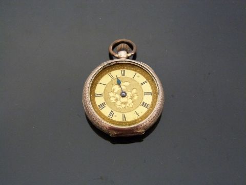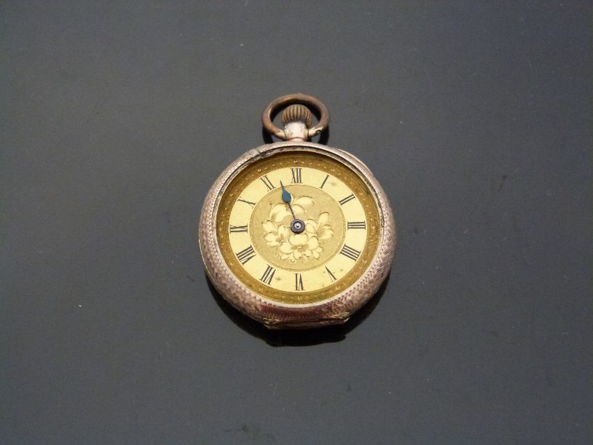 A 9ct gold ladies keyless winding open faced pocket watch with engraved self coloured face, Roman numerals, blued hands and engraved case, case diameter 30mm, 21.g.