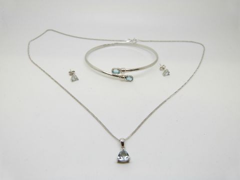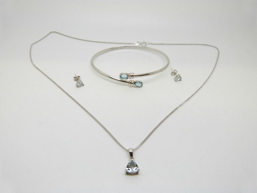 A 9ct white gold bangle set with two aquamarine and a 9ct white gold pendant and chain set with a blue topaz with matching earrings, 7.7g