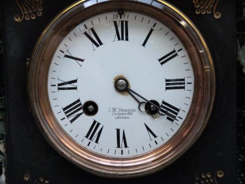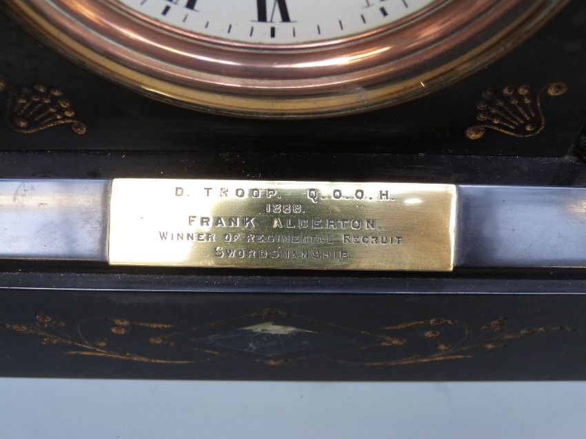J W Beson, Ludgate Hill, London, 19thC slate mantel clock with signed movement no 34276, striking on a bell. The enamel Roman dial with breguet style hands, brass plaque to "D Troop, Q O O H 1888, Frank Alderston winner of Regimental Recruit Swordsmanship". 24cm tall