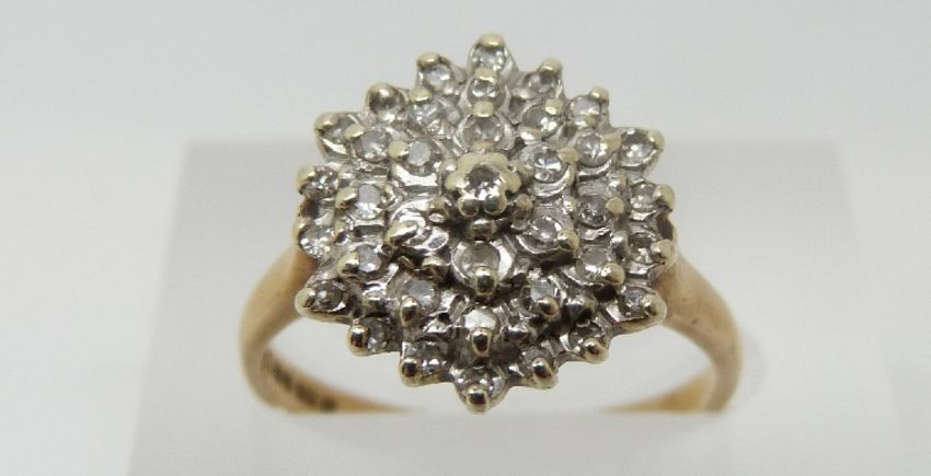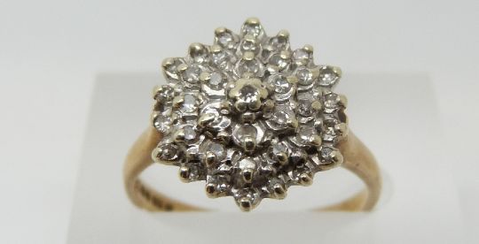 A 9ct gold ring set with diamonds in a cluster, 3.11g (size L)