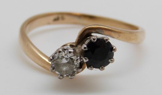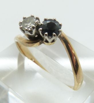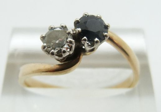 A 9ct gold ring set with a diamond of approximately 0.25ct and a sapphire in a twist setting, size Q/R, 2.77g