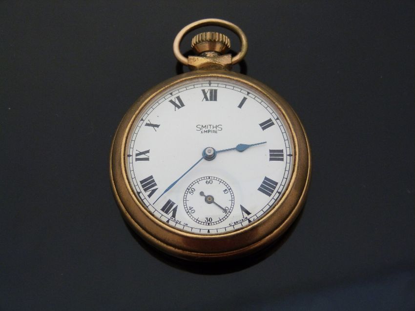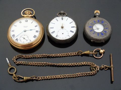 Two hallmarked silver cased pocket watches, one a ladies half hunter fob watch with blue enamel Roman numerals, Birmingham 1805 the other with fusee lever movement, London 1857, a Smiths Empire gold plated pocket watch and an Albert watch chain with attached key