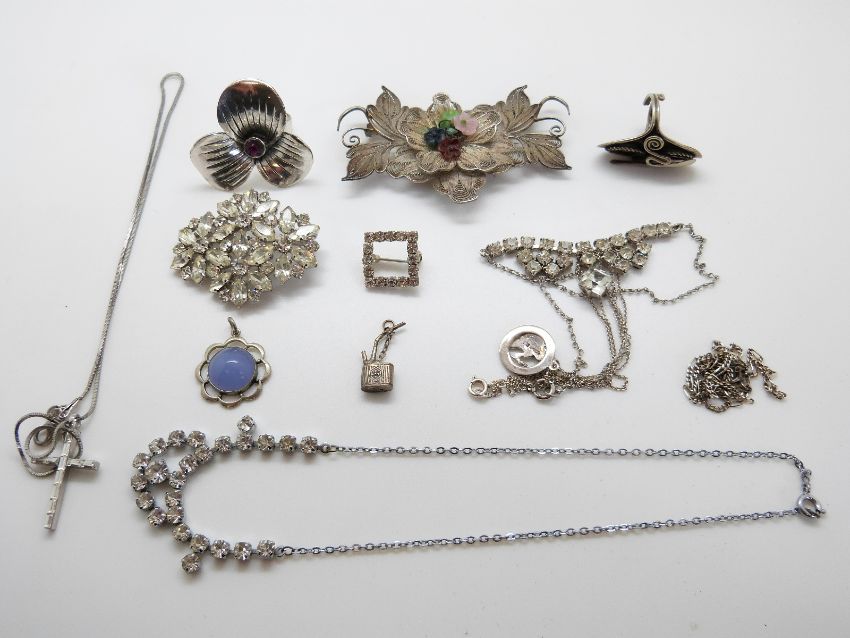A filigree brooch, two diamanté necklaces, silver necklace etc