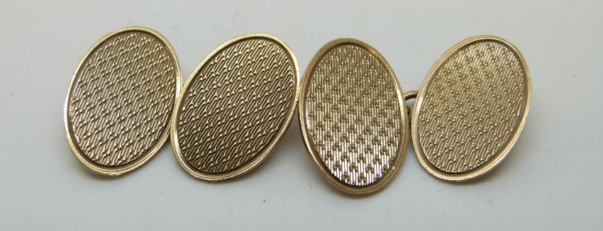 A pair of 9ct gold cufflinks with engine turned decoration, 5.6g