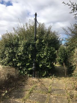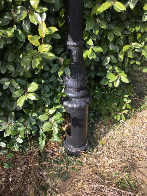 A cast iron Victorian/Victorian style street lamp base Situated nearest to house, next to a shrub