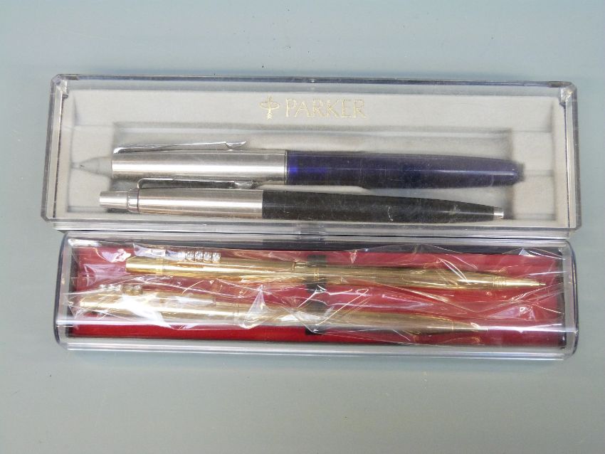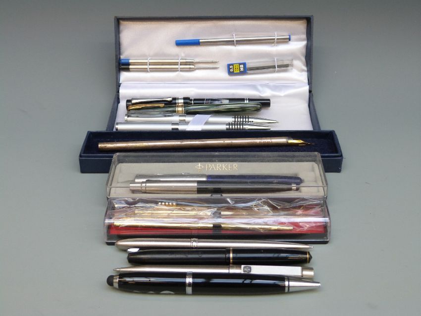 A Waterman's fountain pen with 14ct gold nib, Conway Stewart 15, Parker pens, hallmarked silver dip pen, cased set of pens etc