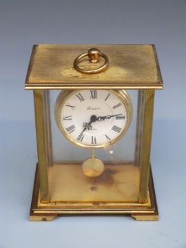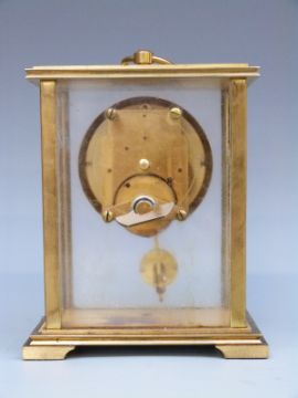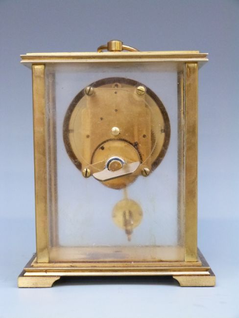 Rapport c1960s single train brass carriage style clock with pendulum and keyless 8-day movement. The Roman white enamel dial with maker's name and black filigree hands