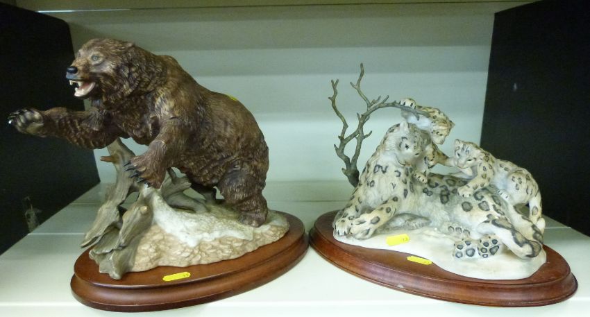 Franklin Mint 'Grizzly' figure and a 'Frisky and Free' leopard and cubs figure, both on wooden plinths