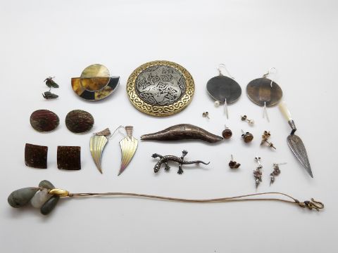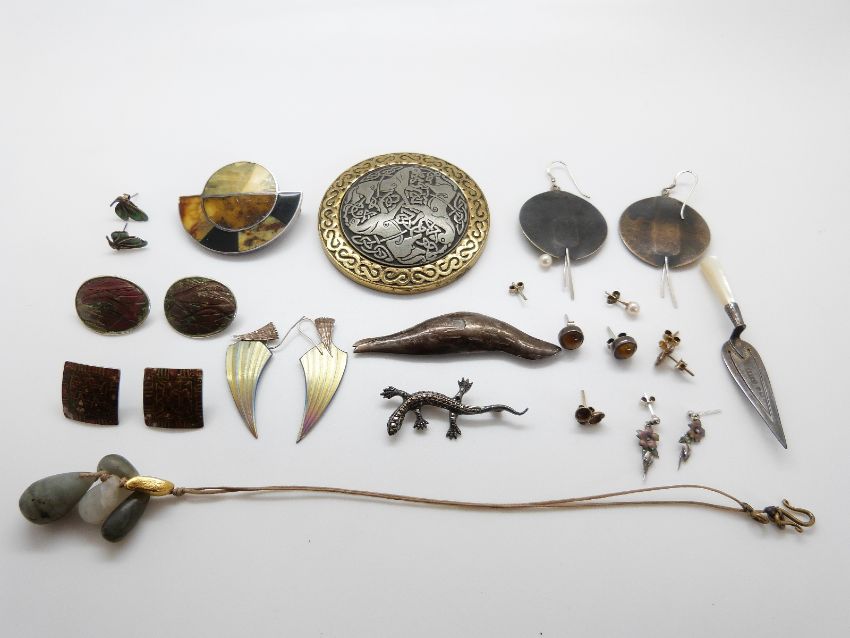 Three silver brooches, earrings, labradorite necklace, silver earrings etc