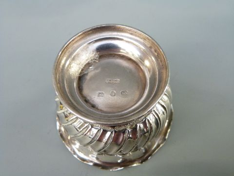 A pair of Victorian hallmarked silver pedestal salts with wrythen decoration and crimped rims, Birmingham 1890 maker Barnet Henry Joseph, diameter 4.5cm, weight 35g