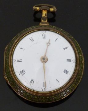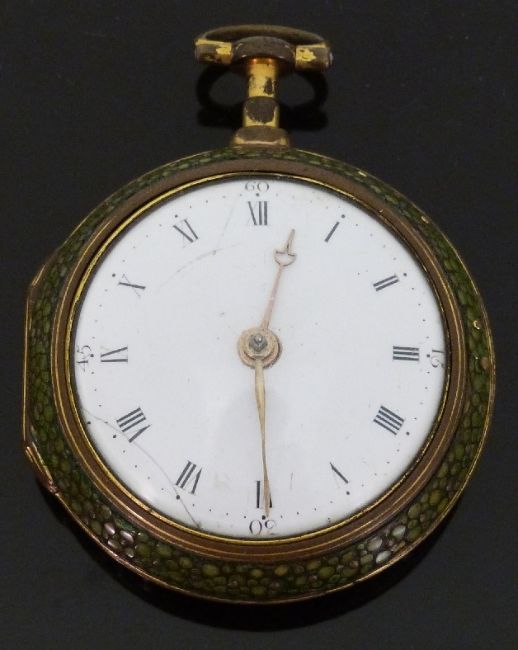 Francis Linderby of London pair cased gilt metal pocket watch with Roman numerals, Arabic 15, 30, 45 and 60 minute markers, gold hands, white enamel dial, shagreen covered and gilt studded outer case, fusee movement signed 'Francis Linderby London' and dated 1788, verge escapement, diamond balance jewel, engraved back plate, pierced and engraved balance cock and four pillar supports, with two steel watch keys, case diameter 50mm.