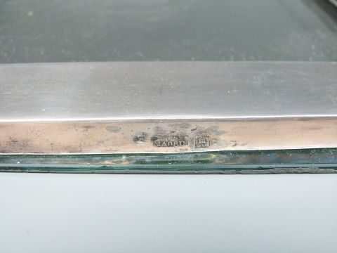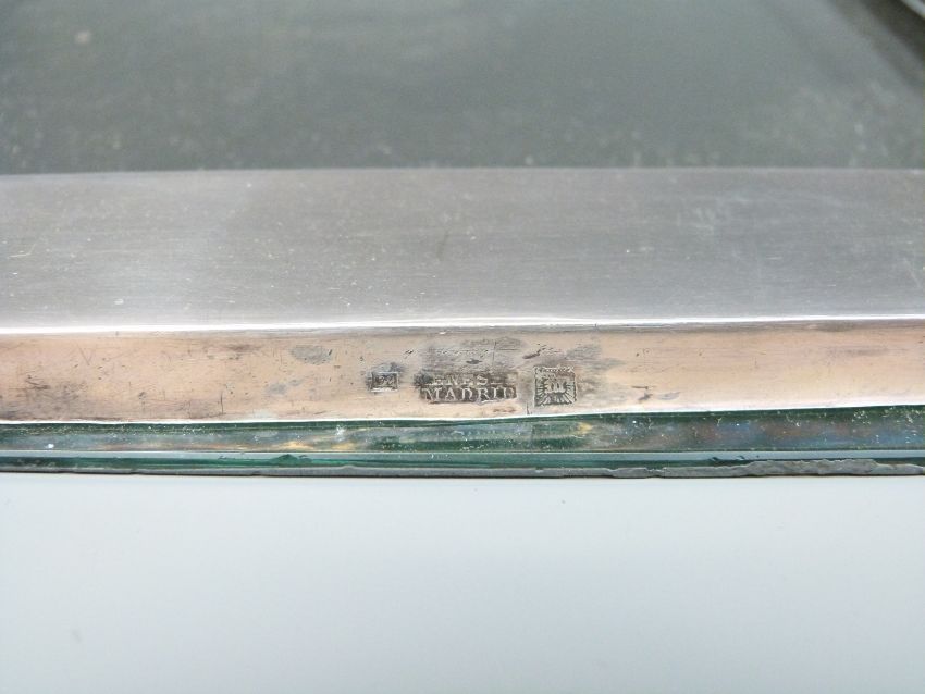 A Spanish white metal or similar Art Nouveau bevelled glass mirror impressed marks including Menese Madrid, 31 x 21cm