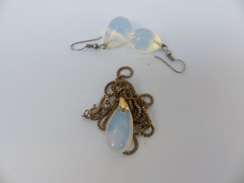 A moonstone necklace, shell pendant, moonstone earrings, silver and pearl necklace, silver earrings etc