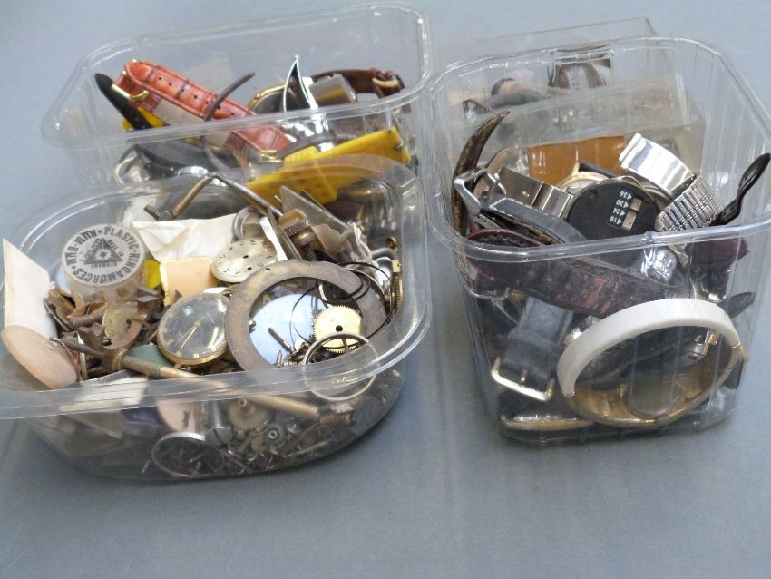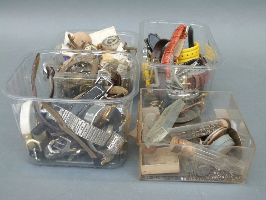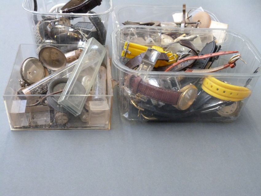 A quantity of watches including replica examples, nickel cased pocket watch, watch parts including military 6B/159 watch back, pocket watch case marked 'fine silver'