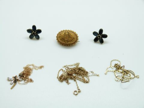 A pair of yellow metal earrings set with sapphires in a flower cluster, a 9ct gold pendant set with diamonds and sapphires in the form of a dragonfly on 9ct gold chain, two 9ct gold chains (3.4g) and a Victorian brooch