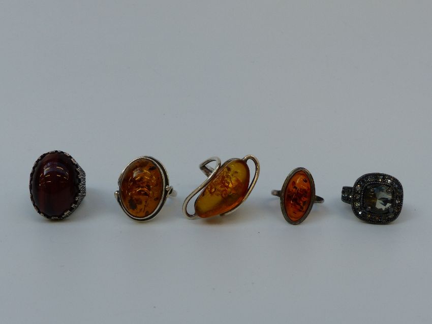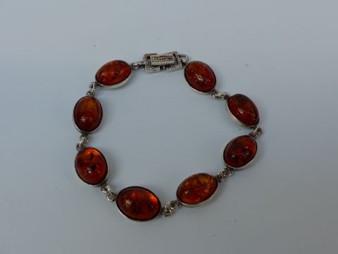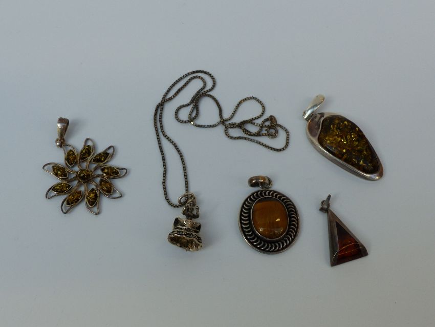 A collection of silver jewellery set with pressed amber, a silver pendant set with tiger's eye and a silver necklace all in a silver plated jewellery box