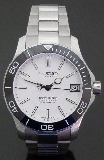 Christopher Ward Trident COSC 600 gentleman's automatic diver's wristwatch ref c60-42 with date aperture, luminous hands and baton markers, trident lollipop seconds hand, white face, black rotating bezel, stainless steel case and 31 jewel calibre SH21 movement, on stainless steel bracelet, limited edition 48 of 300, case diameter 43mm, serial number 0001088, in original box with outer box.