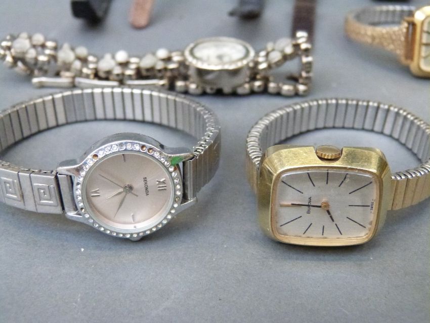 Twenty-one various ladies and gentlemen's wristwatches including Bulova, Smiths, Empire Seiko, MuDu, gold plated examples etc