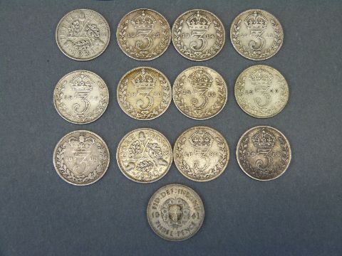 Queen Victoria 1845 young head half crown, together with thirteen silver 3d pieces including 1930 and a 1918 KN penny