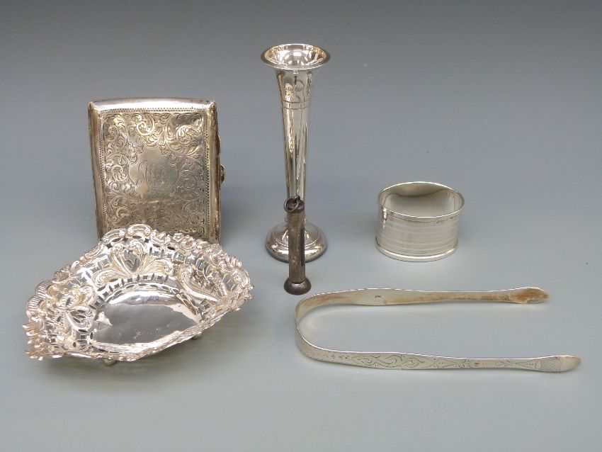 A Victorian hallmarked pierced bon bon dish, Chester 1895, bright cut Georgian silver sugar tongs, silver cigarette case, napkin ring and a hallmarked silver cigar piercer, weight all in 197g