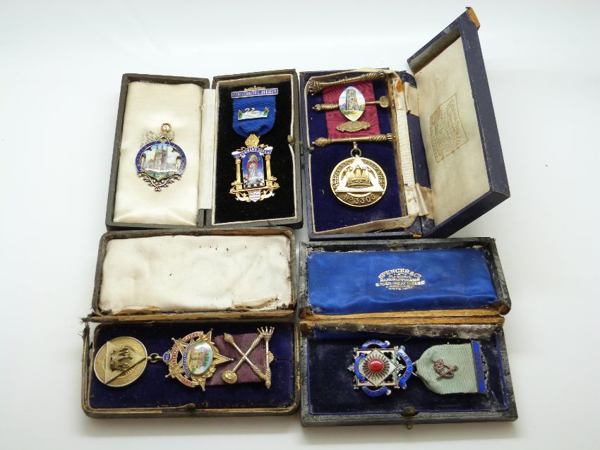 Four hallmarked silver and enamel Masonic jewels / medals, lodges include St Mowdens 4850, Abbott Lichfield 3308, Helio 3900 and Eltham Palace 2980