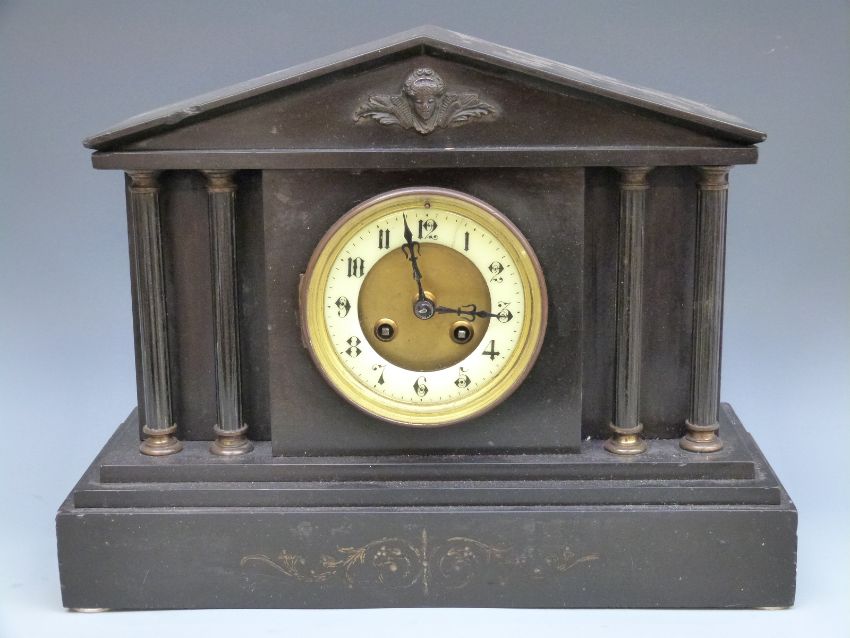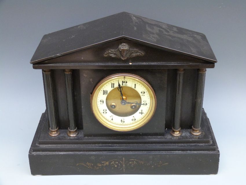 Japy Freres 19thC French two-train slate mantel clock, the Arabic ivory coloured chapter ring with beetle design hands, the Roman architectural case with reeded column decoration with bronze capitols and winged end mask feature above and the named movement striking on a gong. 28cm tall