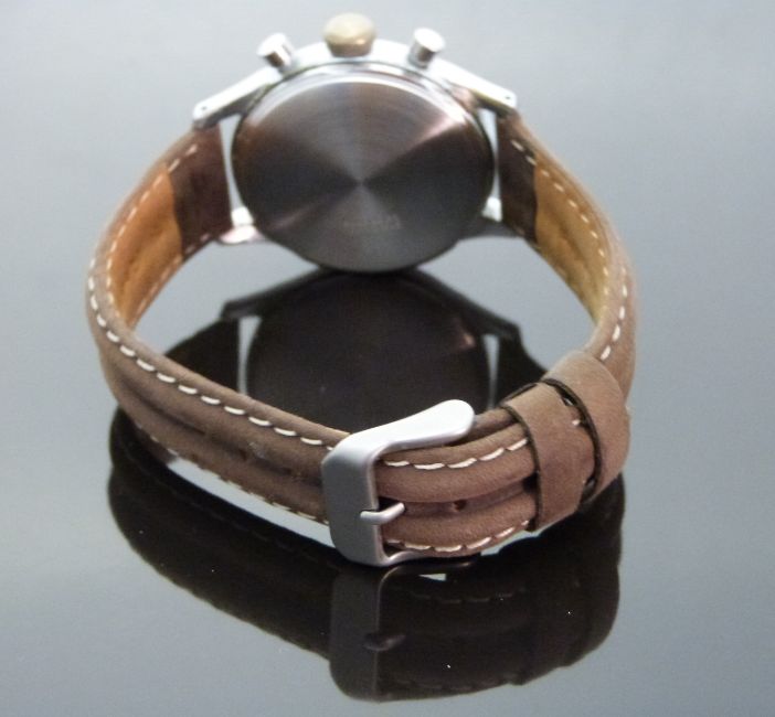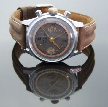 Charles Nicolet Tramelan gentleman's chronograph wristwatch with gold hands and dot markers, inset subsidiary dials showing seconds and minutes, Arabic 6 and 12 numerals, champagne face, stainless steel case and signed 17 jewel movement, marked to the case back 209, on brown leather strap, case diameter 36mm.