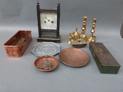 Huntley and Palmer biscuit tin, brass blotter, brass candlesticks, American clock etc