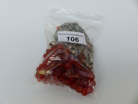 A graduated beaded carnelian agate necklace and a white metal necklace set with rose quartz, carnelian and other agate