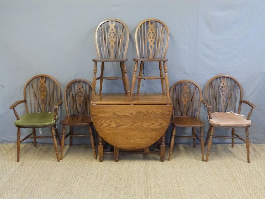 An oak drop leaf table and six (4+2) wheel back chairs, width of table 90cm, maximum length 154cm
