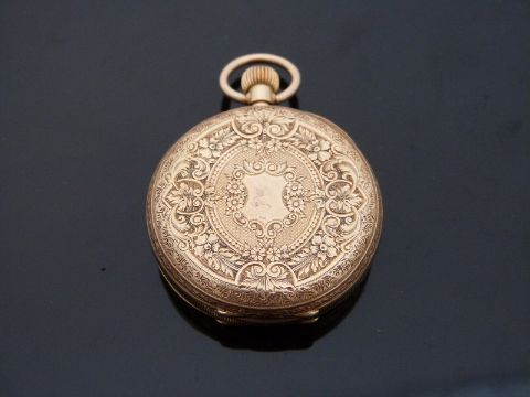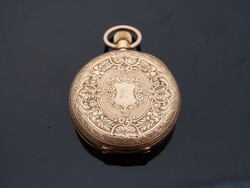 An 18k yellow metal cased ladies fob watch with engraved foliate decoration, marked to case 18k, weight 45.4g