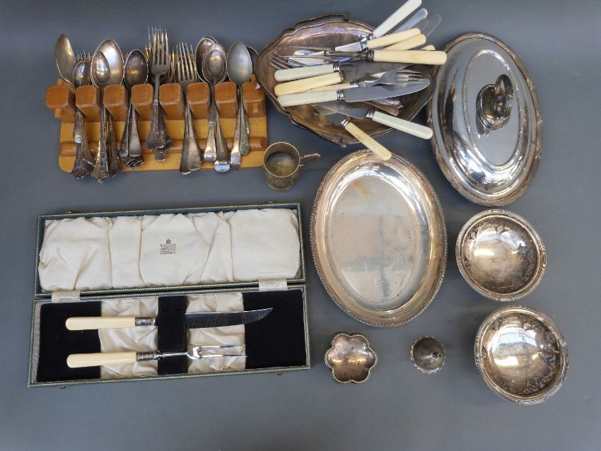 A collection of plated ware including a cased Garrard carving set, pair of pierced bon bon dishes, cutlery etc