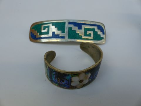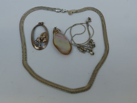 A collection of silver jewellery including a watch, Alpaca brooch and bracelet, lapis lazuli bracelet, silver necklaces etc
