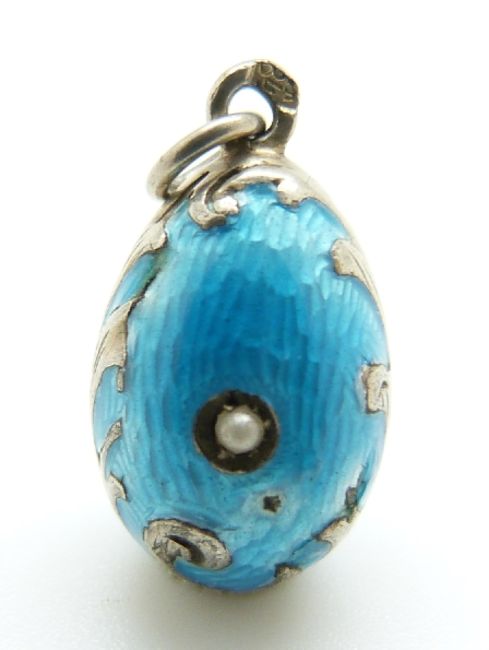 A Russian silver egg pendant set with aqua enamel, 'XB' to one side and a seed pearl to the other, marked 84, L13 x W9mm