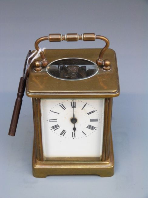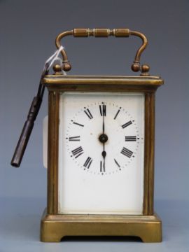 A French late 19thC /early 20thC carriage clock in brass corniche style case. The white enamel Roman dial with blued steel spade hands