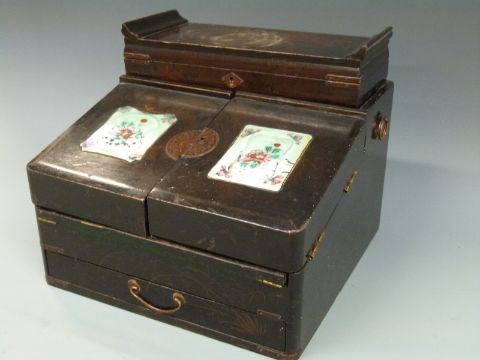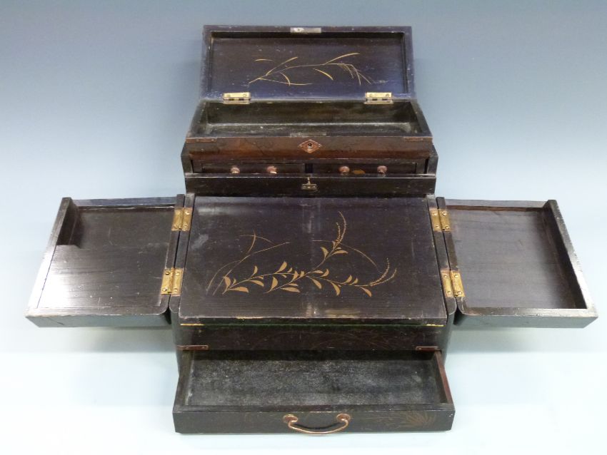 A Japanese lacquer travelling writing slope with pop up drawers to rear, width 24cm