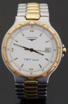 Longines Conquest VHP gentleman's wristwatch ref. 4016 with date aperture, gold and luminous hands, gold baton markers, white face, gold plated bezel, stainless steel case and quartz movement, on two-tone stainless steel and gold plated bracelet, case diameter 35mm, serial number 25805426, in original box with outer box, instructions, certificate card and four spare links.