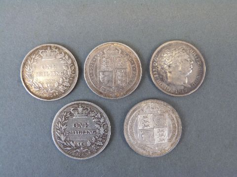 Five various shillings including George III, William III, Victoria young head and jubilee head