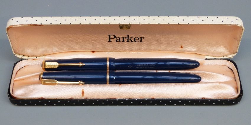 Parker Junior fountain pen set with blue resin barrel and cap, gold plated mounts and 14ct gold nib, in vintage Parker box, together with a further loose example