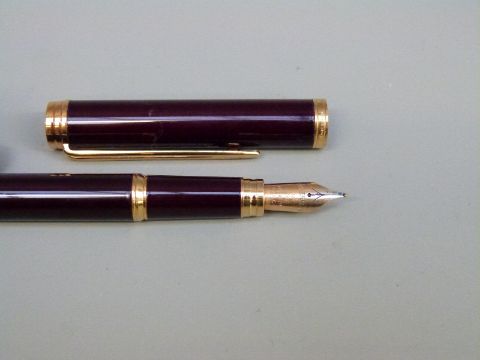 Waterman Ideal fountain pen with maroon barrel and cap, gold plated fittings and 18ct gold nib, 14.1cm long, in original box.