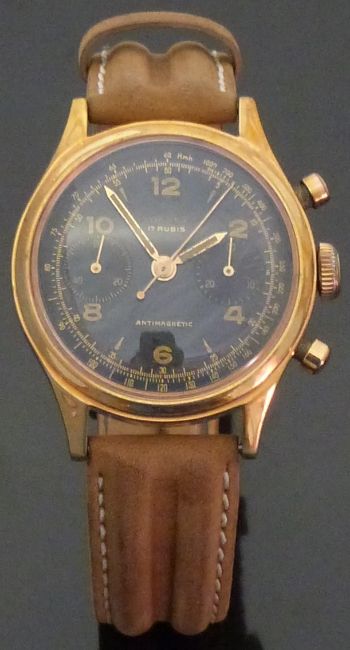 Tollet gentleman's chronograph wristwatch with gold hands and Arabic numerals, subsidiary seconds dials showing seconds and minutes, black dial, gold plated case and 17 ruby movement, marked to case back 3501, on brown leather strap, case diameter 36mm.
