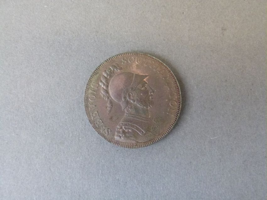 Southampton halfpenny token 1791 VF / EF together with an 1811 Bristol penny near VF and two Bristol farthings 1660 and 1662, one holed
