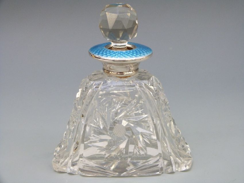 A hallmarked silver and guilloché enamel cut glass scent / perfume bottle, London 1928 maker H Pidduk & Sons, height 10.5cm