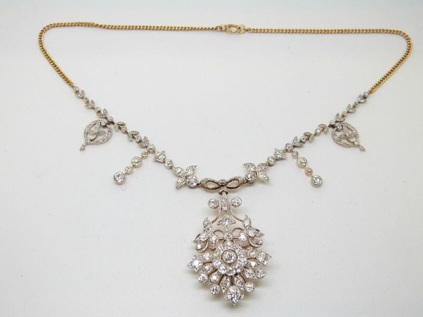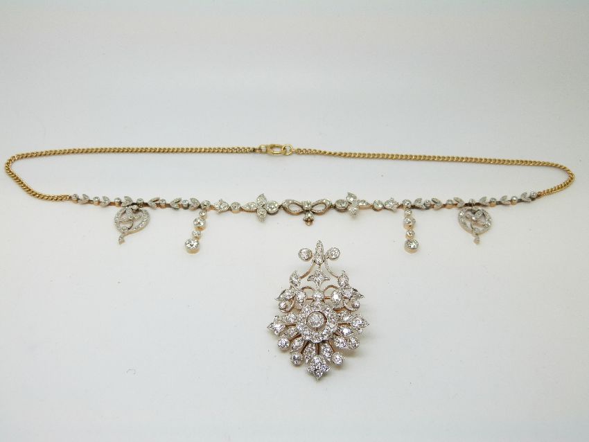 A Belle Epoque diamond set necklace / brooch in a foliate and floral design, the largest diamond approximately 0.3ct, the lower section detachable for use as a brooch