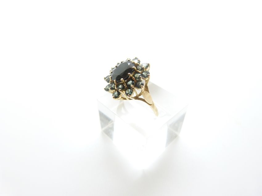 A 9ct gold ring set with an oval sapphire surrounded by tourmaline, size N/O, 4.86g