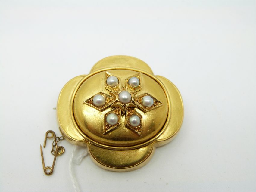 A Victorian yellow metal brooch set with seven pearls in a flower design, with glass compartment verso set with hair