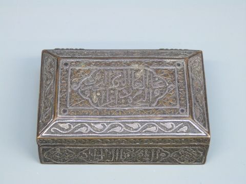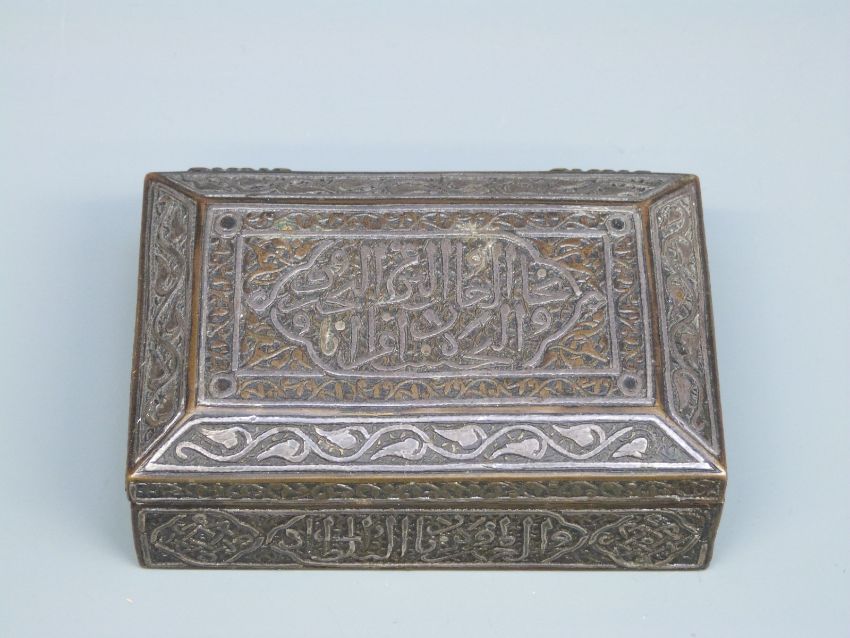 A 19thC white metal and brass hinged prayer box, width 9cm