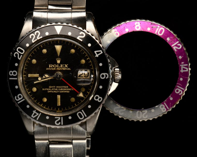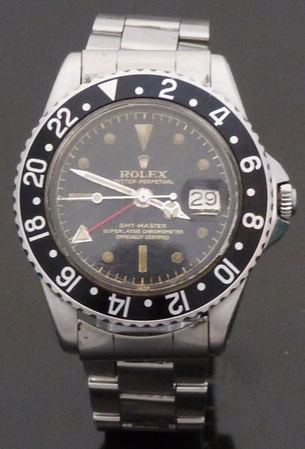 Rolex Oyster-Perpetual GMT-Master gentleman's wristwatch ref. 1675 with date aperture at 3 o'clock, luminous dot, baton and triangular markers, luminous and steel hands with Mercedes hour hand, red arrow-tipped second time zone hand, white chapter ring, rotating black bezel, original red and blue 'Pepsi' bezel, black dial marked 'Superlative Chronometre Officially Certified' and 'Swiss' at 6 o'clock and stainless steel case, on stainless steel bracelet stamped 4 72, 7836 and 358, case diameter 39mm, serial number 506027, in original box with Rolex charm, outer cardboard box and related paperwork. The watch was purchased by the vendor whist serving in the military through the Navy, Army and Air Force Institute (NAAFI) and the bezel was replaced when he was working as a flight crew training officer for British Airways when many of the pilots changed to the black bezels.